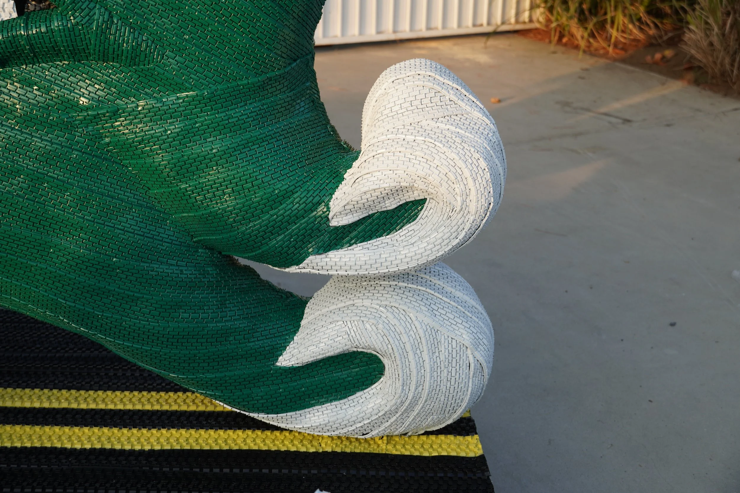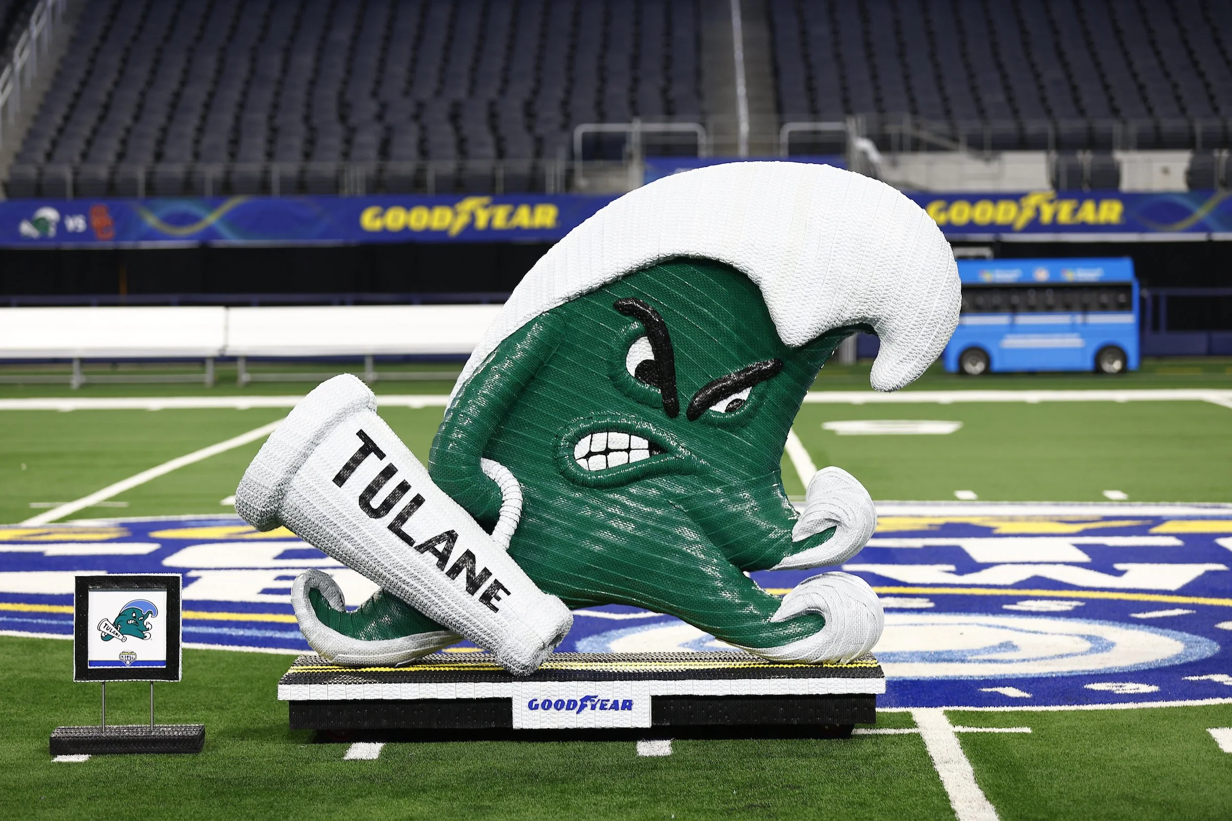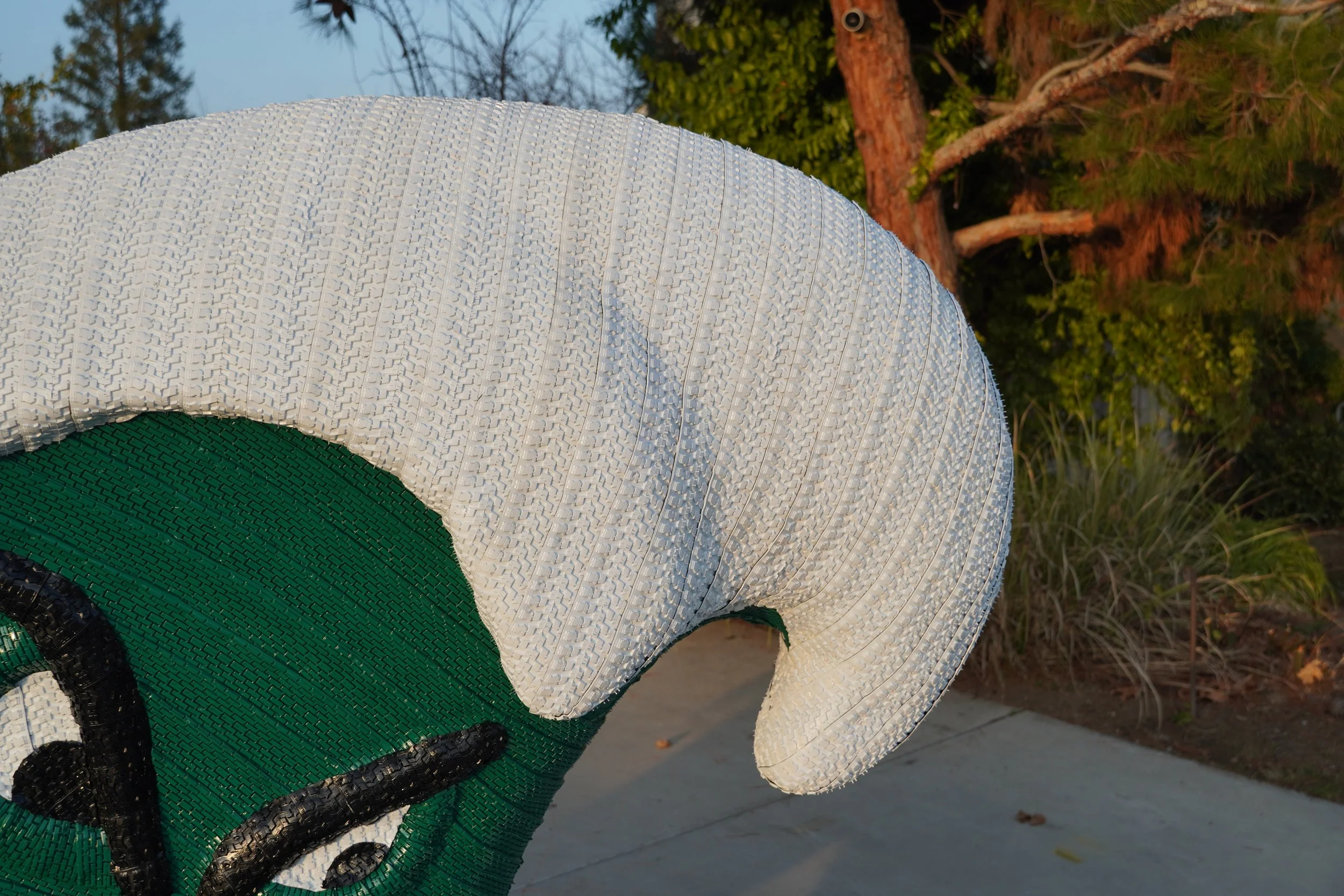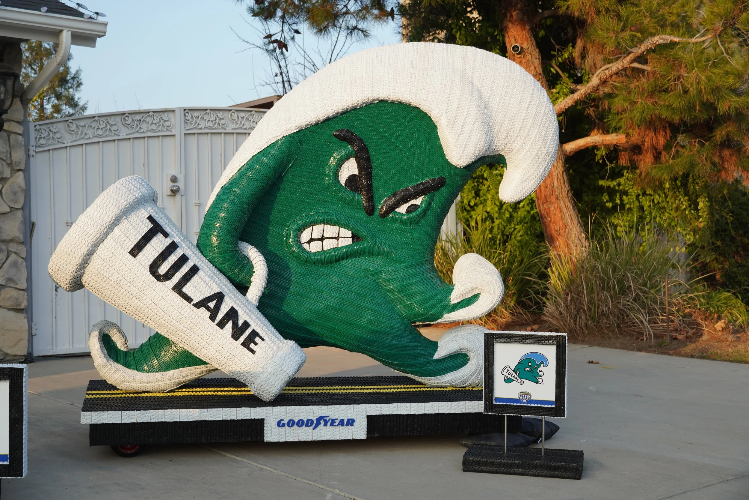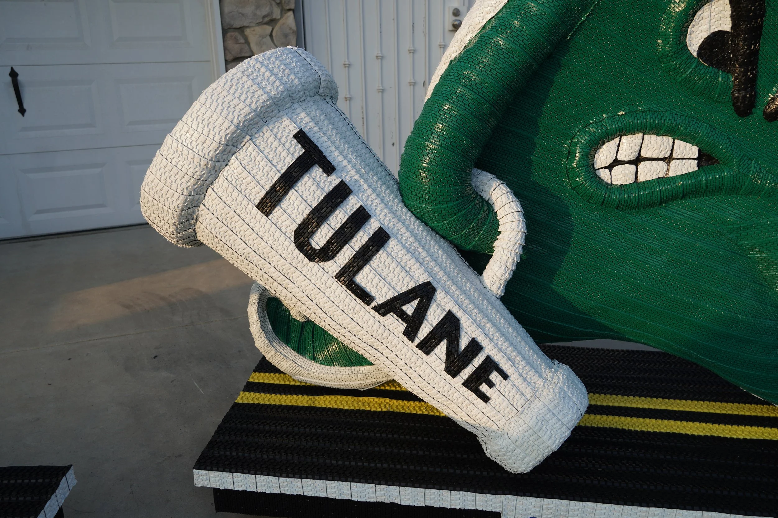 This sculpture was built to celebrate the 87th Goodyear Cotton Bowl Classic between both competing teams, USC and Tulane University. This sculpture stands 6’5” tall and uses over 215 Goodyear tires. The inner structure was hand carved out of pink insulation foam, then a steel armature was welded inside. Once secured, the foam was fiberglassed to add rigidity and give support to the thousands of staples and screws which support the tires. The tires were all hand painted and clear coated. This sculpture was commissioned by Goodyear Tires and will be displayed at AT&T Stadium in Dallas, TX. Goodyear will donate the sculpture to Tulane University after the Game on January 2nd, 2023.