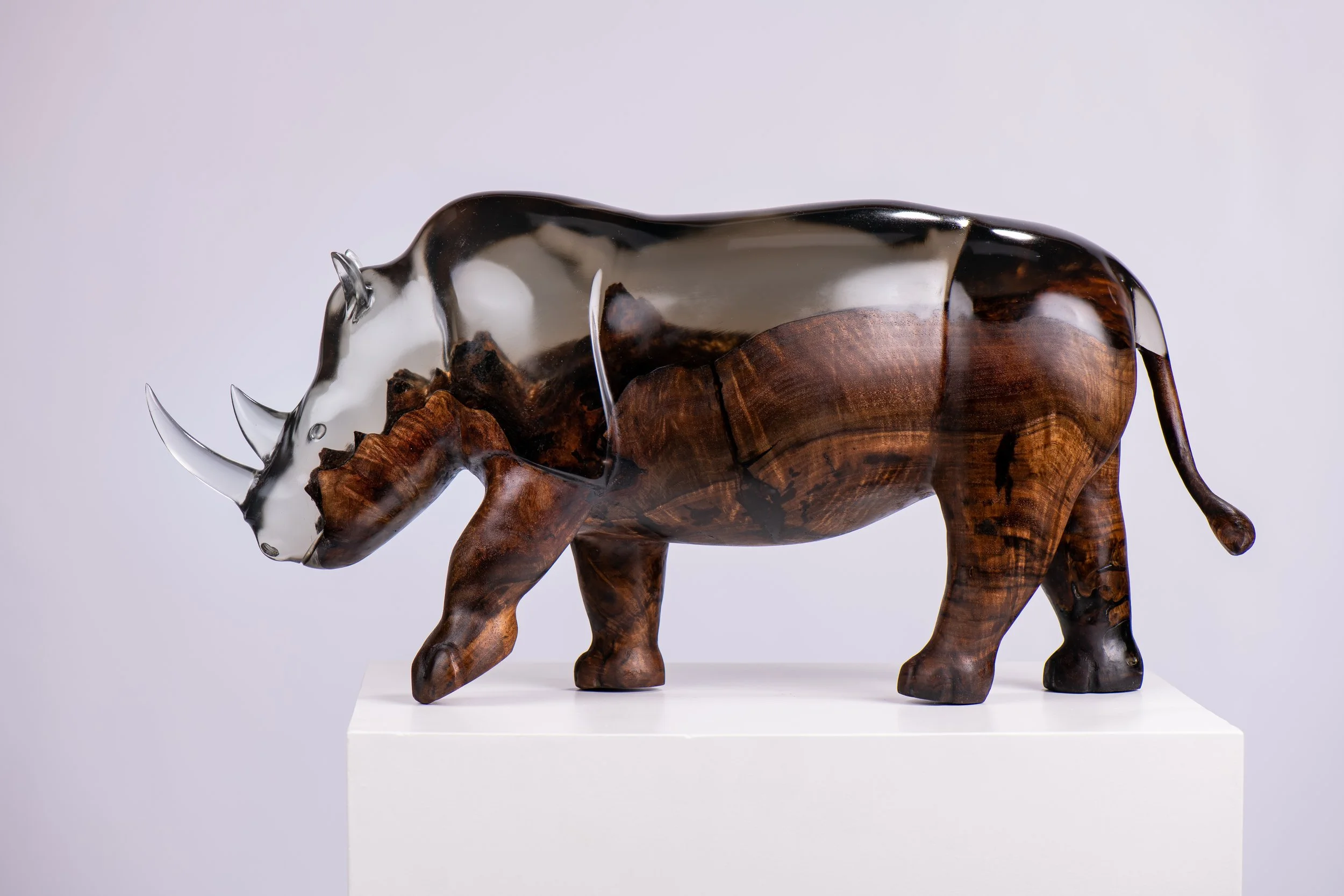 I carved a Black Rhino out of a hand selected piece of Black Walnut Burl and 8.5 gallons of epoxy resin. I first cut the burl to size and cleaned up all the debris. I then poured 8.5 Gallons of resin in a mold and let cure for 10 days. Once the epoxy was cured, I used a chainsaw as well as other power tools to carve the rhino out of the block. I then hand sanded the entire sculpture from 60 grit up to 5000 grit before polishing and finishing.